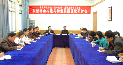 校黨委組織部部長孫曉峰認(rèn)為,和諧社會是人類的共同的理想,也是我們黨帶領(lǐng)全國人民為之奮斗的目標(biāo)。和諧校園就是要以人為本、充滿活力的校園,公平公正、和而不同的校園,依法治校、發(fā)揚(yáng)民主的校園,安定團(tuán)結(jié)、融洽和諧的校園、文明高雅、環(huán)境優(yōu)美的校園。構(gòu)建和諧校園,要營造濃厚的氛圍,加強(qiáng)宣傳、輿論引導(dǎo)和理論研究;在教書育人、管理育人、服務(wù)育人中,要以教師為本,將制度規(guī)范約束與人文關(guān)懷相結(jié)合;在教育教學(xué)工作中要以學(xué)生為本,培養(yǎng)德智體美勞全面發(fā)展的社會主義建設(shè)者和接班人;要重視領(lǐng)導(dǎo)班子的建設(shè),實(shí)現(xiàn)管理干部、教師、學(xué)生之間的和諧;要重視校園文化建設(shè),培養(yǎng)大學(xué)和諧文化精神。孫曉峰部長最后說,我校是安徽省“三個代表”重要思想中心的研究基地,承擔(dān)著重要的研究任務(wù)和職責(zé),希望研究基地的各位研究員潛心鉆研,多出高水平的成果,研究基地將進(jìn)一步積極開展研討等活動,活躍學(xué)術(shù)氛圍,同時加大研究資助的力度。