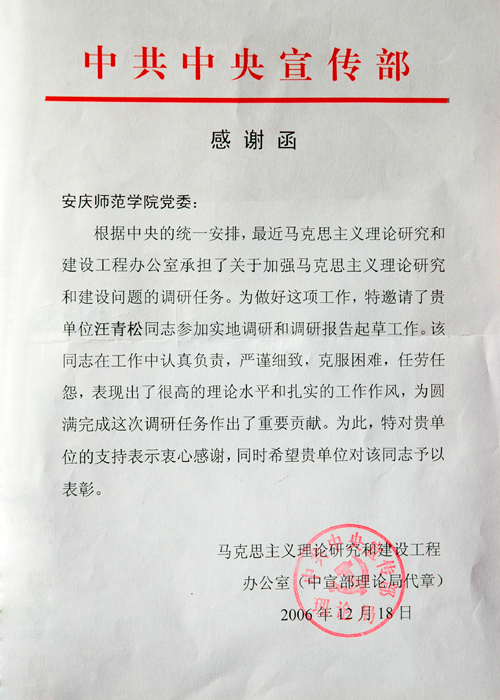 日前,根據中央統一安排,我校黨委副書記、院長汪青松教授參加了中央馬克思主義理論研究和建設工程辦公室承擔的關于加強馬克思主義理論研究和建設問題的調研任務,現調研任務圓滿完成,中共中央宣傳部特向我校黨委致感謝函,表彰汪青松院長在調研中所做的重要貢獻。(宣傳部)