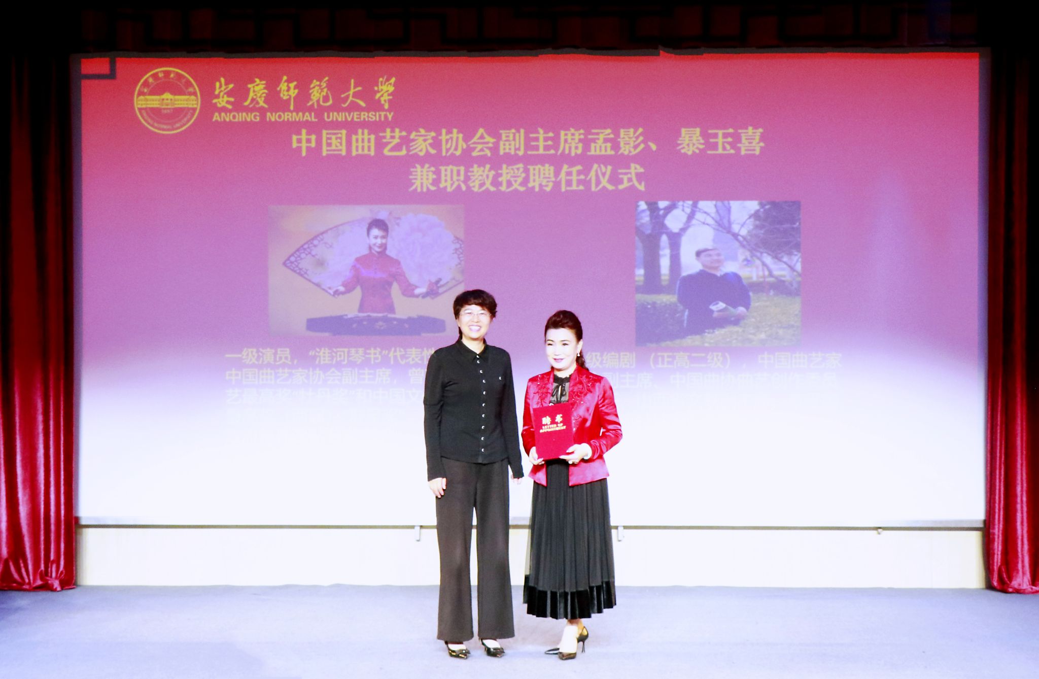 彭鳳蓮分別為孟影、暴玉喜頒發兼職教授聘書,對他們加盟我校表示熱烈歡迎。彭風蓮介紹了學校的發展歷程、基本情況和辦學特色。她表示,中國曲藝家協會兩位副主席的加盟,必將對學校曲藝學科建設產生重大而深遠的影響。希望黃梅劇藝術學院進一步強化曲藝學科建設,全力推進戲曲與曲藝博士點立項建設,培育打造標志性成果,為中華優秀傳統文化創造性轉化和創新性發展作出新的貢獻。