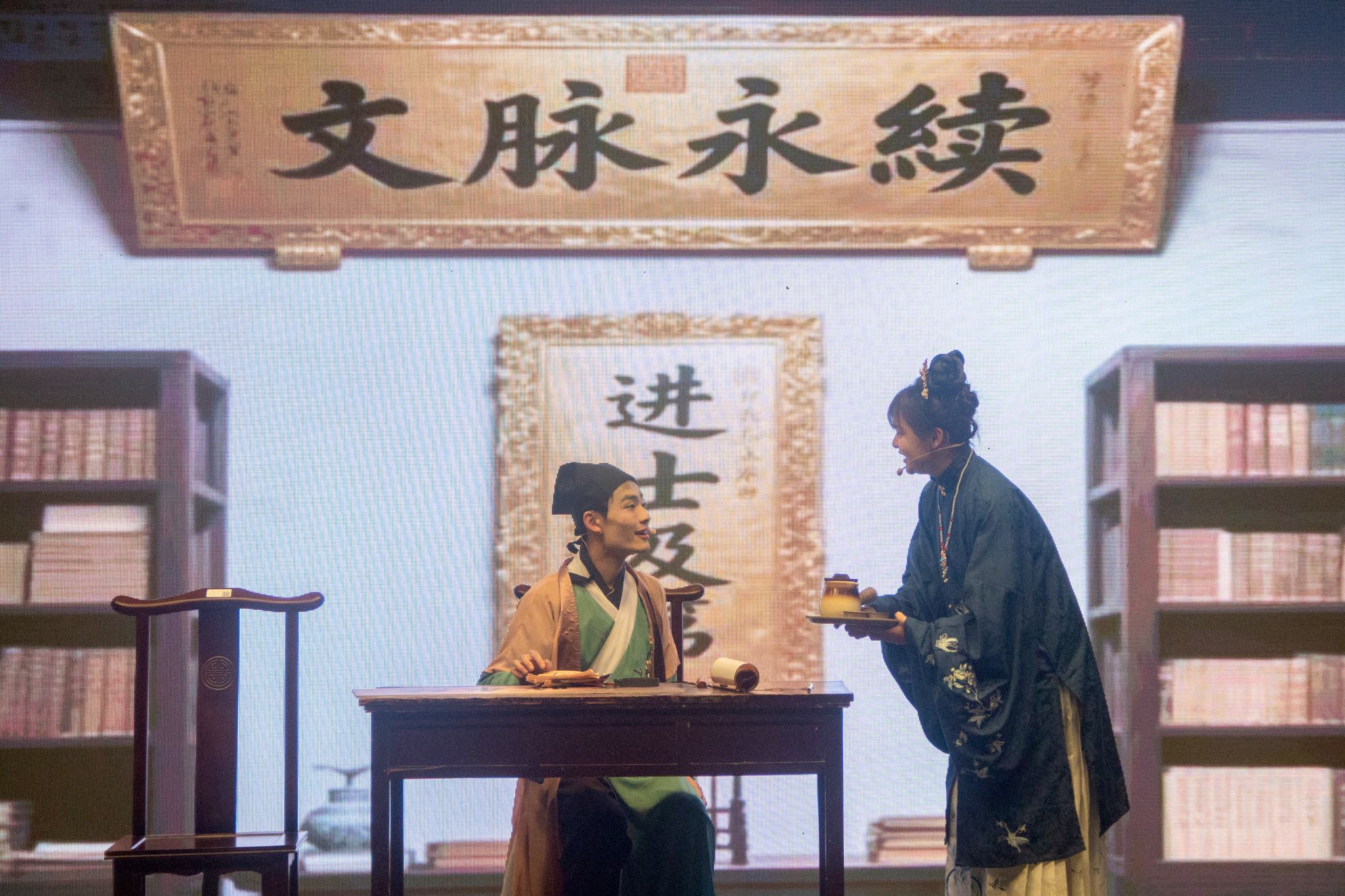 “朝碧海而暮蒼梧,睹青天而攀白日。”作為晚會的重頭戲,話劇《碧海蒼梧》講述了我國邁出科學考察長江江源征程的第一人徐霞客文明尋根的故事。劇本創作者之一、中國語言文學類專業 2024(1)班陳心怡在研讀《徐霞客游記?江源考》等文獻時,被徐霞客勇于探索、堅定執著的精神所感動,“與指導老師商量后,我們敲定了這個選題,希望通過這部話劇,讓更多同學從徐霞客執著‘探源’的人生追求中,領悟長江文化的精神內核,形成敬畏自然的文明自覺,激勵同學們在找尋‘何以中國’的答案中,成為文化尋脈的踐行者。”