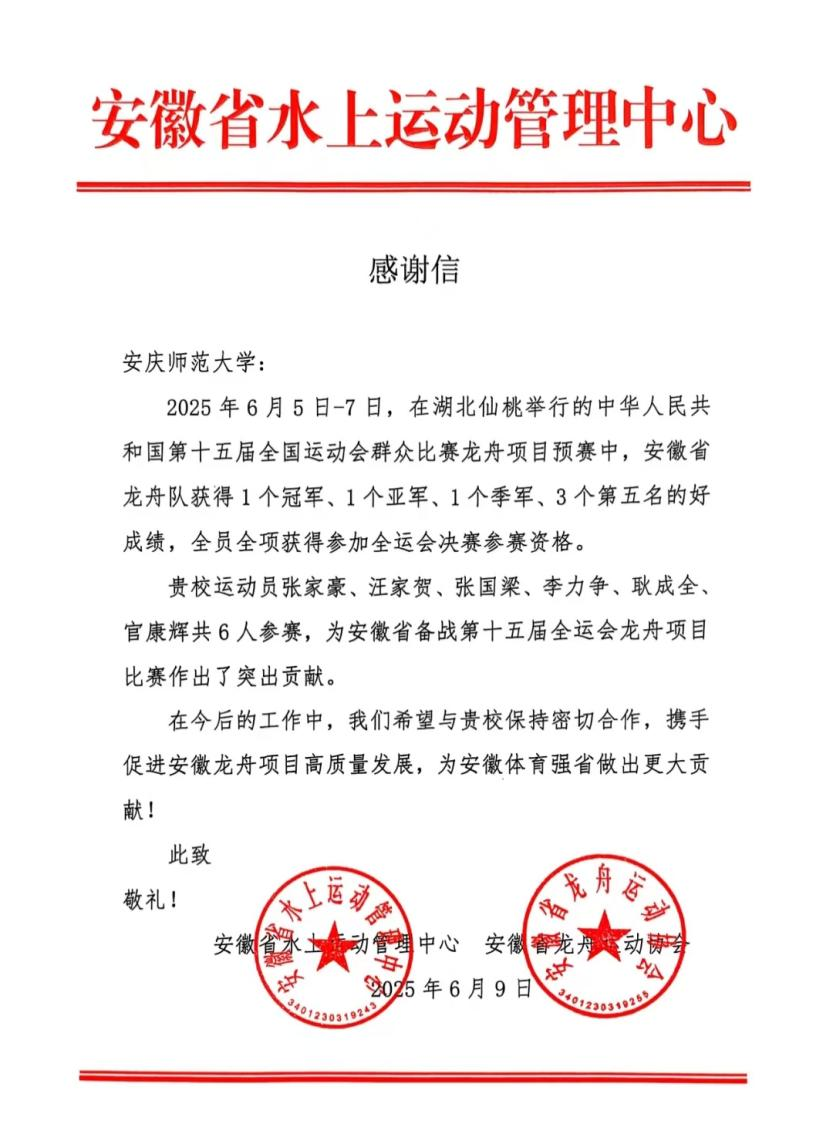 6月5日至7日,第十五屆全國運(yùn)動(dòng)會(huì)群眾比賽項(xiàng)目龍舟預(yù)賽在湖北仙桃舉行。我校龍舟隊(duì)隊(duì)員張家豪、汪家賀、張國梁、李力爭、耿成全、官康輝等6名學(xué)生代表安徽省出戰(zhàn),在全運(yùn)會(huì)龍舟預(yù)賽中獲得了混合組22人龍舟100米冠軍、500米銅牌,男子組22人龍舟200米第五名、500米第五名。安徽省水上運(yùn)動(dòng)管理中心發(fā)來感謝信,予以表彰。