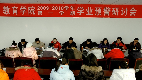 為進一步加強學生的學業管理,及時了解學生的學習狀況,提高對學生學業的指導性、預見性,幫助學生順利完成學業,提高教學質量和學生的綜合素質,1月6日下午,教育學院在行政樓五樓會議室成功召開了2009—2010學年第一學期學業預警研討會,這是教育學院第三屆學業預警研討會。教育學院黨政領導、相關負責同志以及學生會負責人、各班學生代表參加了會議。會議由教育學院黨總支副書記任其平主持。