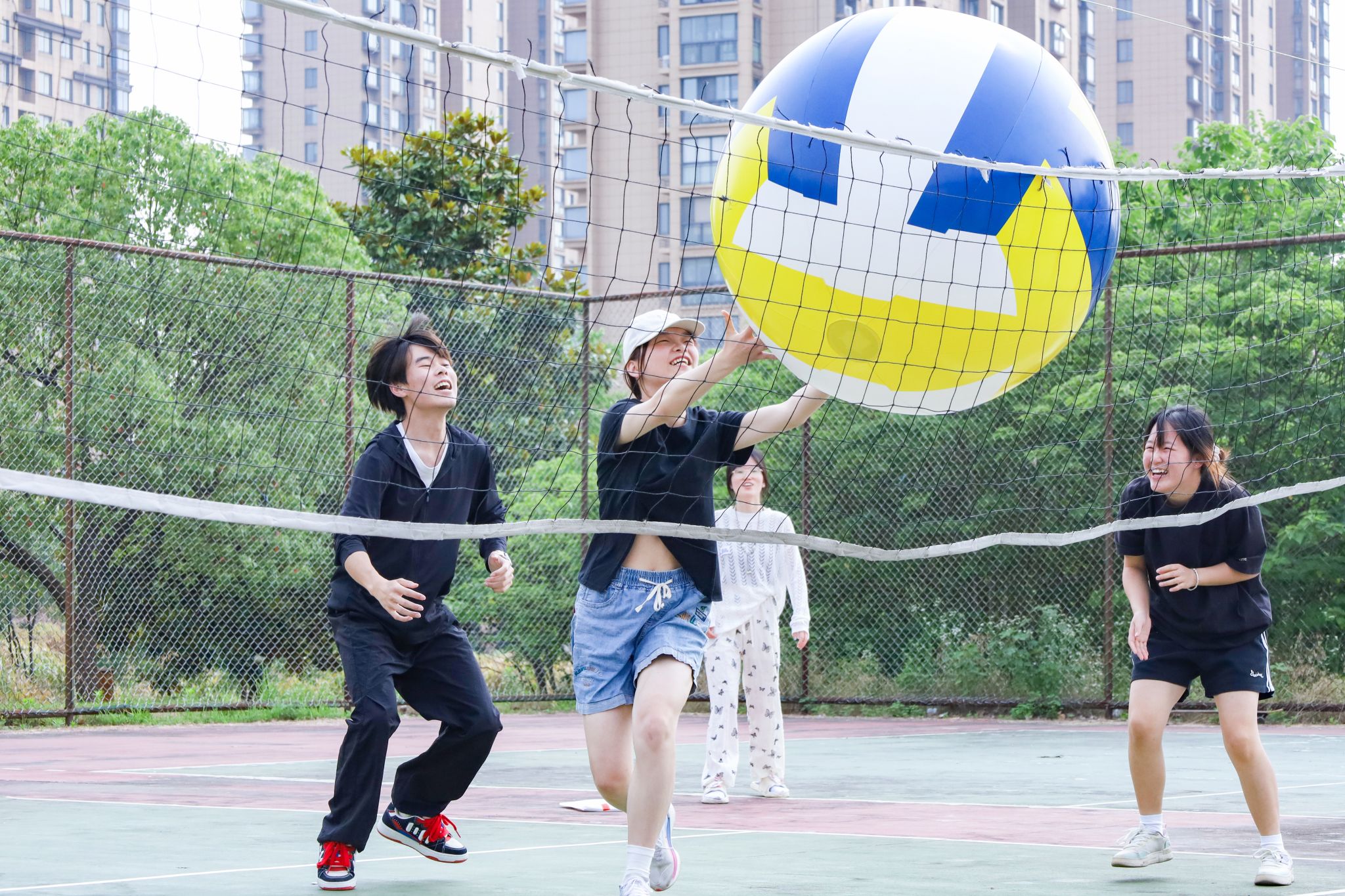 調整支架、拉緊纜繩、按壓氣泵……下午兩點,活動準備工作已緊鑼密鼓展開。美術學院體育部成員雙手拽住纜繩末端,隨著“咔嗒”一聲鎖扣咬合,原本松垮的網面瞬間繃成筆直的銀線。另一側,三名學生正合力為直徑1.2米的巨型排球充氣,美術學專業2024(2)班鐘書朗半跪在地反復按壓氣泵,橡膠球體隨著“咝咝”作響的氣流聲逐漸膨脹。