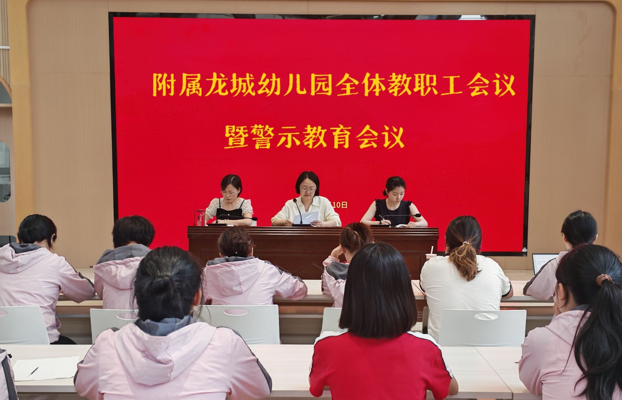 6月10日,附屬龍城幼兒園召開全體教職工會議暨警示教育會議。黨支部書記、園長姚萍主持會議,全體教職工參加會議。