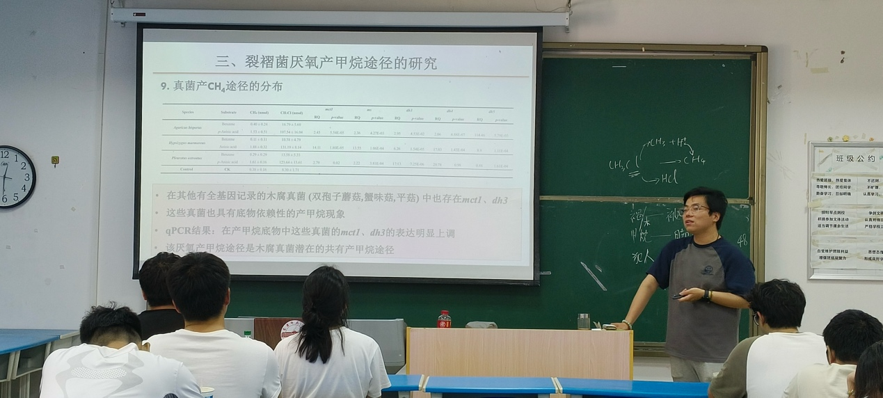 5月16日,生命科學學院黃欣博士在G103作“裂褶菌厭氧降解褐煤/木質素產甲烷的發現、 證明及代謝機理” 學術報告。生命科學學院生態學專業本科生和研究生聆聽學術報告。