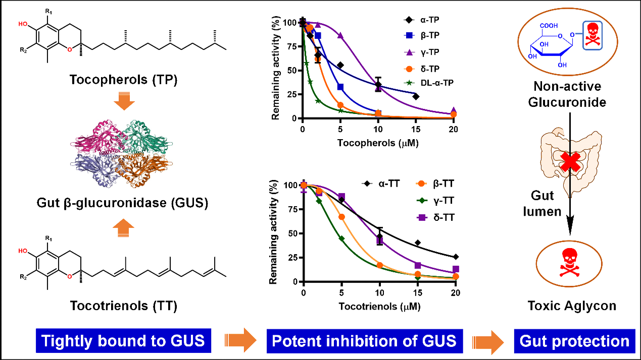 該研究首次發現腸道β-葡萄糖醛酸糖苷酶(GUS)是維生素E的一個新作用靶點。GUS由腸道菌群分泌,能夠水解β-葡萄糖醛酸苷類化合物,增加有毒苷元在腸道中的暴露水平,引發腸道毒副作用。維生素E作為食品中廣泛存在的高效抗氧化劑,其安全性已得到充分驗證。研究表明,保護腸道免受GUS介導的毒性影響可能是維生素E的一項潛在新功能,這為開發靶向GUS的腸道毒性防護策略提供了創新性思路。