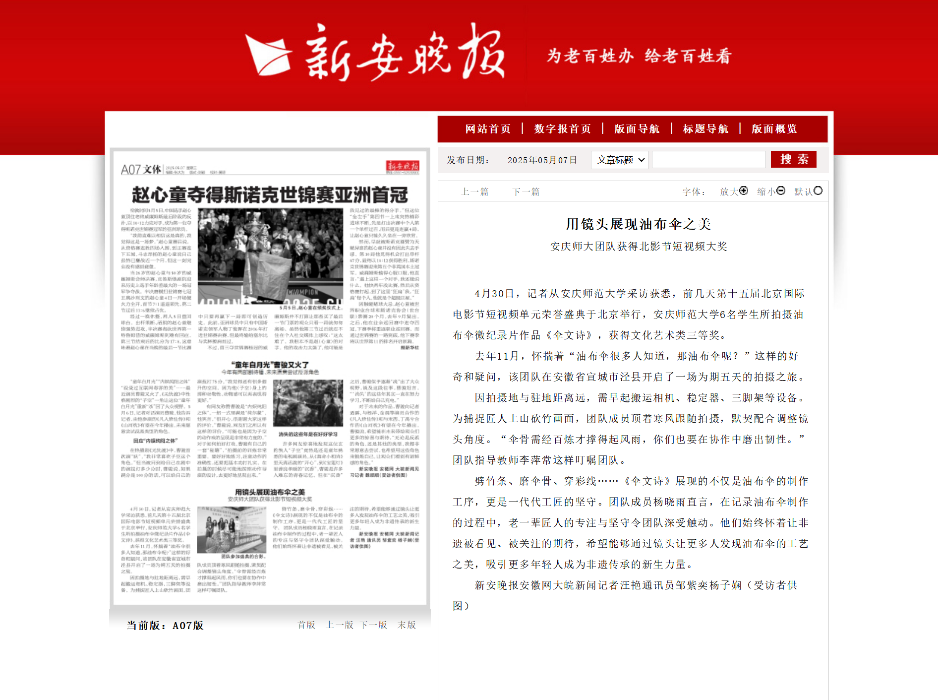 新安晚報:用鏡頭展現(xiàn)油布傘之美 安慶師大團隊獲得北影節(jié)短視頻大獎