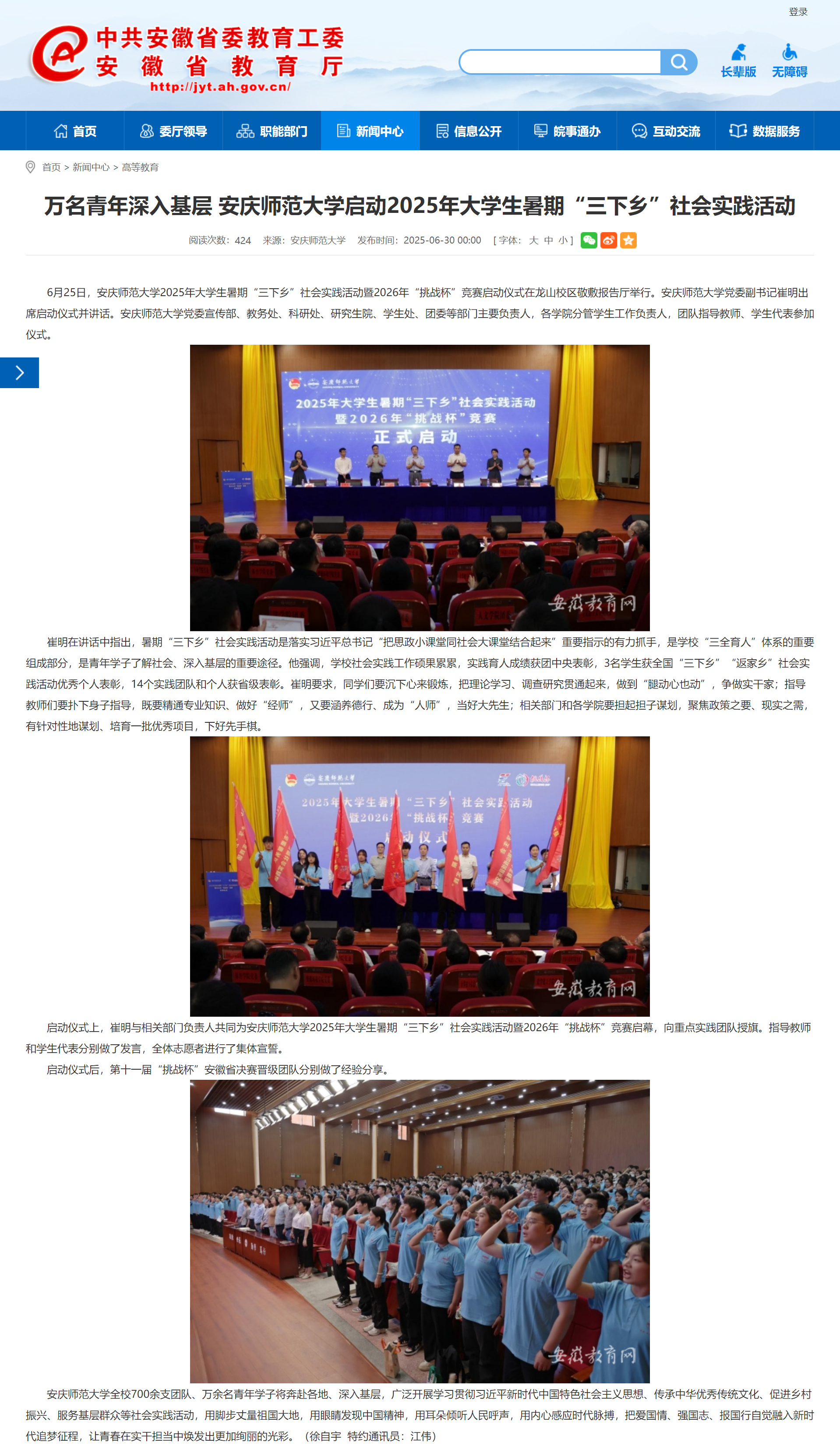 安徽教育網(wǎng):萬(wàn)名青年深入基層 安慶師范大學(xué)啟動(dòng)2025年大學(xué)生暑期“三下鄉(xiāng)”社會(huì)實(shí)踐活動(dòng)