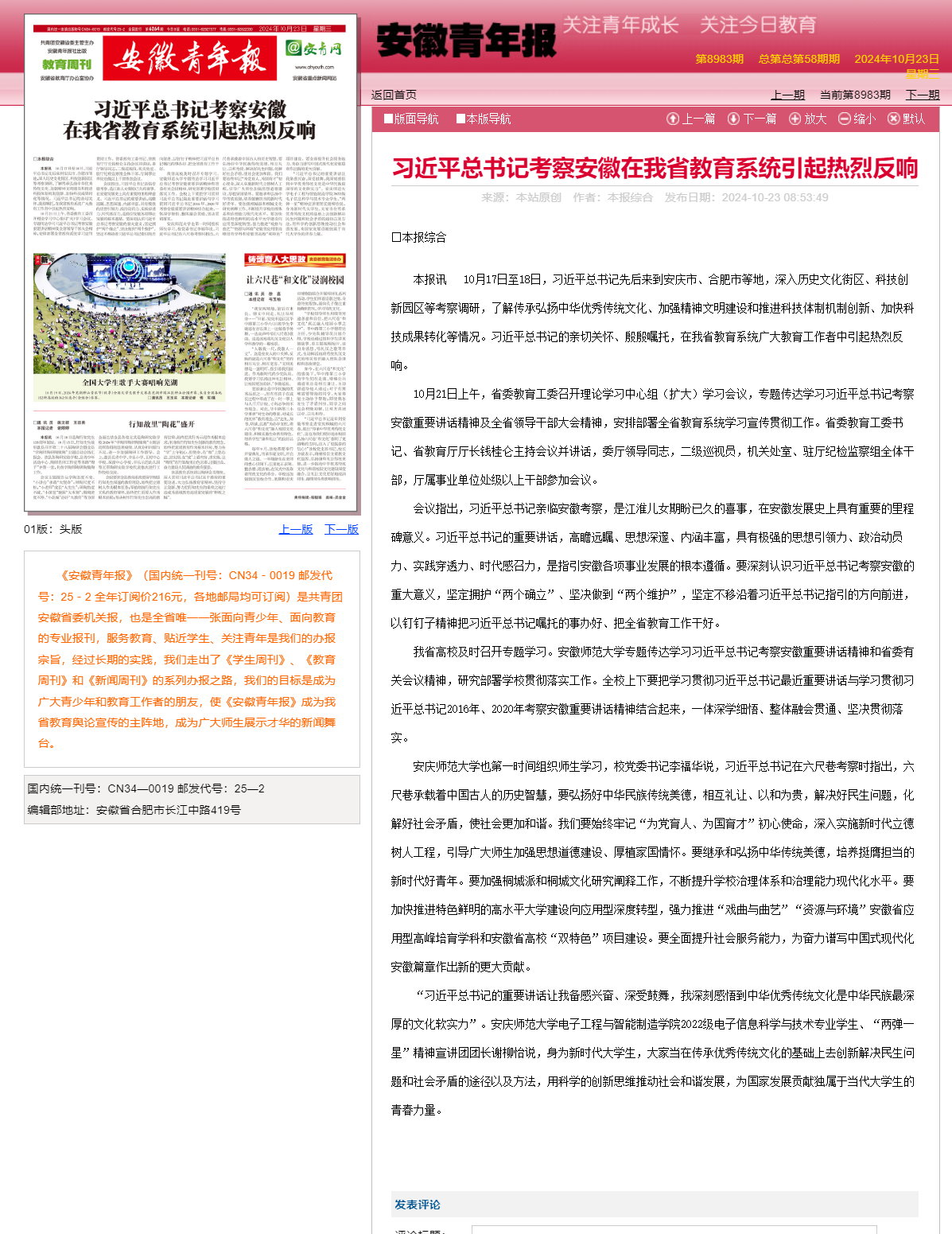 10月17日至18日,習(xí)近平總書記先后來到安慶市、合肥市等地,深入歷史文化街區(qū)、科技創(chuàng)新園區(qū)等考察調(diào)研,了解傳承弘揚(yáng)中華優(yōu)秀傳統(tǒng)文化、加強(qiáng)精神文明建設(shè)和推進(jìn)科技體制機(jī)制創(chuàng)新、加快科技成果轉(zhuǎn)化等情況。習(xí)近平總書記的親切關(guān)懷、殷殷囑托,在我省教育系統(tǒng)廣大教育工作者中引起熱烈反響。